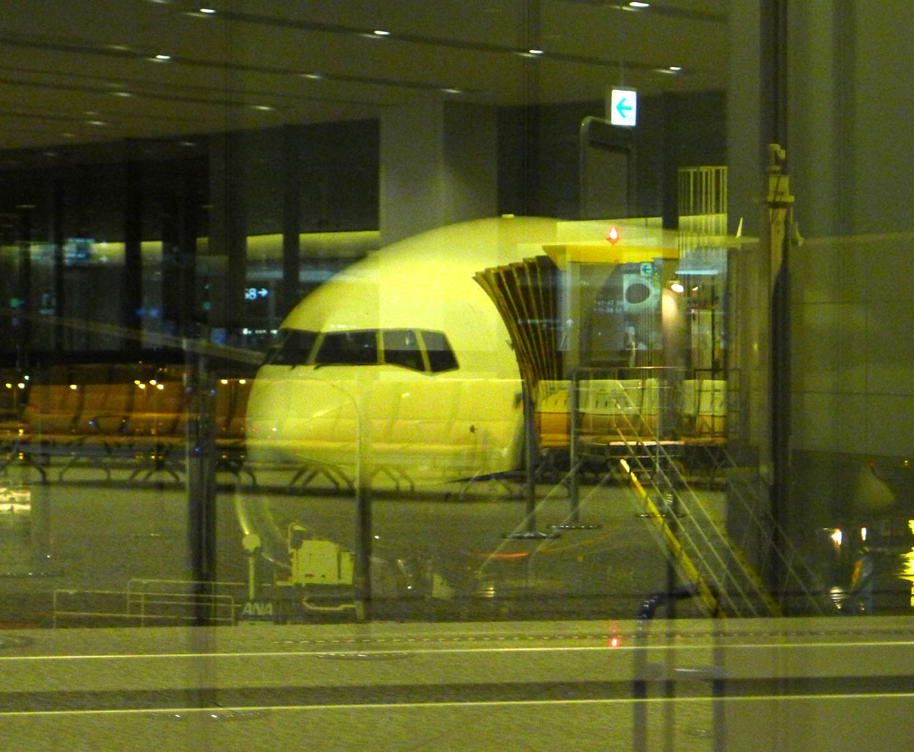 側面が全面ガラス張りで明るいボーディングブリッジです。これ、世界初の段差の一切無いボーディングブリッジだそうです。最新式!